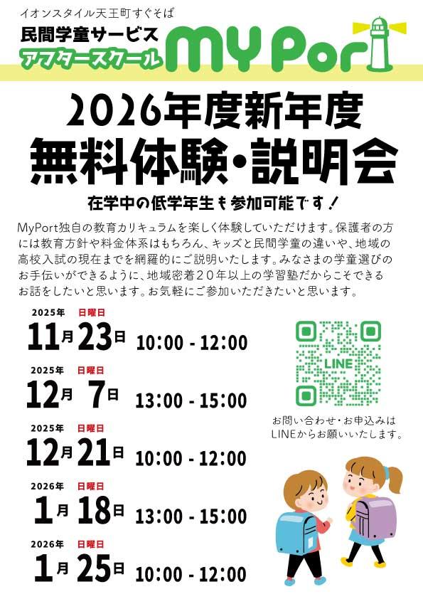 ☆上記チラシ記載の日程で、2026年度からご利用ご希望いただく方にむけた体験会を実施いたします。体験会は何回でも受講できますので、講師や教室、プログラムとの相性をじっくり吟味していただき、納得いただきご入会を検討いただければと思います。